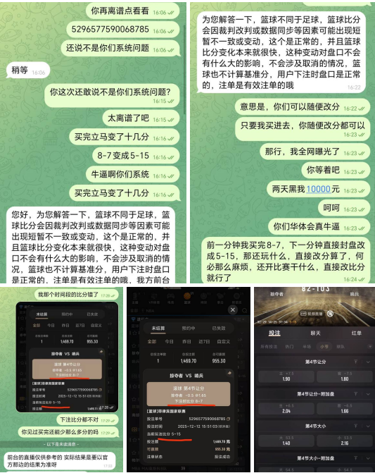本人是亚博系的忠实玩家,我在华体会这个台子前前后后都输了200多个,一直都在玩着的,在今天买了一场菲律宾国家篮球联赛,想着这么大的比赛不会出什么问题,结果华体会平台私自更改比分(在我注单确定进去以后立马封盘更改了11分,对你没看错,直接封盘更改了11分),买的时候是8-7,结果买完就变成5-15,找专属经理和客服都说是正常,赛事比分变化而没影响盘口,注单是有效的,真是搞笑,那我想问下,你见过买时候的比分比买完以后显示的比分还要多的吗,因为华体会系统这种恶意行为导致我被黑,竟然还要我自认倒霉